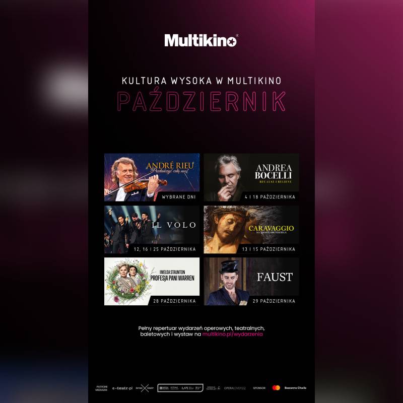 12, 16 i 25 października widzowie zobaczą wielkie show trzech utalentowanych młodych Włochów, którzy z powodzeniem łączą operę i muzykę popularną: „Il Volo: Najnowszy koncert z Doliny Świątyń”. Natomiast 4 i 18 października w Multikinie będzie można zobaczyć dokument „Because I Believe”. Widzowie będą podążali za Andreą Bocellim nie tylko za kulisy, ale również poza scenę, by zajrzeć do jego prywatnego życia – wśród rodziny i najbliższych przyjaciół.